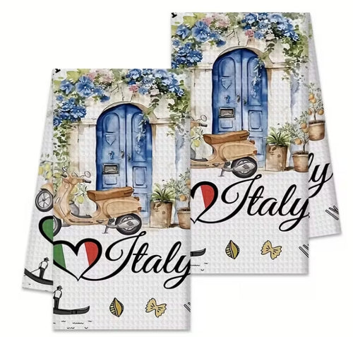 "Italy" Kitchen Towel with Scooter & Floral Doorway (Set of 2)